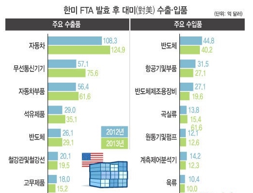 한국무역헙회 국제무역연구원은 14일 ‘한미 FTA 이제 시작이다’라는 보고서를 통해 2012년과 2013년 우리나라의 수출 증가율이 각각 –1.3%, 2.1%에 머무르는 동안 대미(對美) 수출은 4.1%, 6.0%의 증가율을 기록하며 우리 수출의 버팀목 역할을 했다고 평가했다.