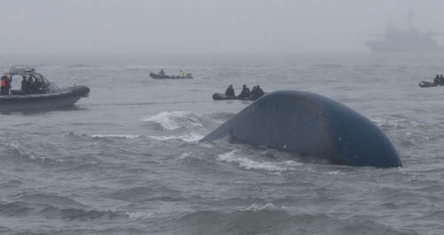 해경 경비정이 선수 앞 10m 부분에 있는 방향 전환용 프로펠러 홈에 밧줄을 매어 놨으나 이제는 그 부분도 현재 물에 잠겨 보이지 않는다.