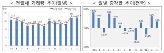 국토교통부는 21일 올 3월 전·월세 거래량이 지난해 같은 기간 보다 3.6% 증가한 14만2289건으로 집계 됐다고 밝혔다.