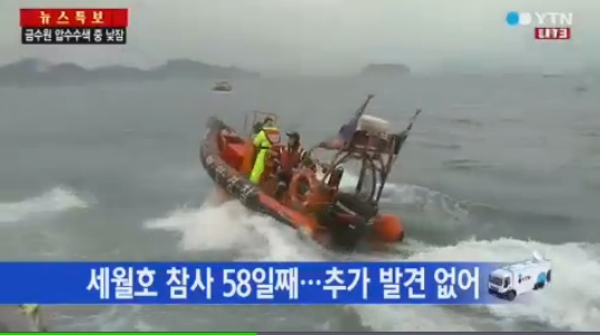 세월호 침몰 사고 58일째인 12일 밤 사이 수색 작업을 펼쳤지만 실종자 찾기에는 실패했다.