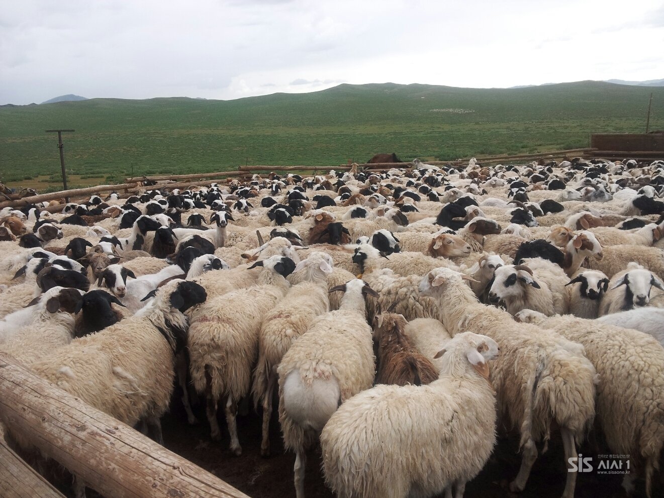 몽골 벌판 초원에 수천마리 양들이 우리 앞에 모여있다.