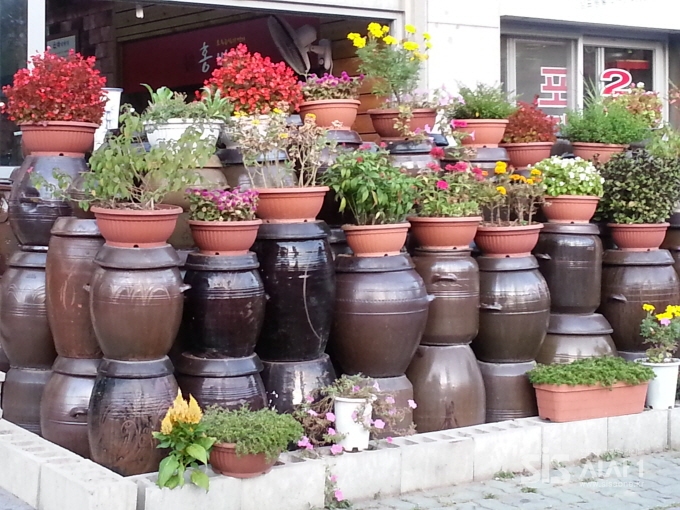 10월 4일 상암동 월드컵경기장 옆 마포구청역 주변 식당앞 장독대 위에 올망 졸망 꽃들이 예쁘게 피어나고 있다.