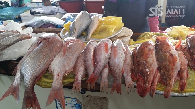 남해안의 한 전통 수산물 시장에는 각종 생선이 진열돼있어 이곳을 찾은 관광객 발길을 멈추고 있다.
