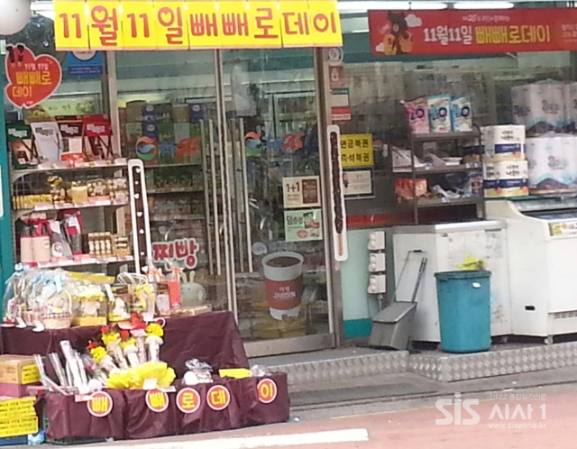 11일 오전 서울의 한 편의점 앞에 11월 11일 빼빼로데이라고 현수막까지 내 걸고 여러 종류의 기획 상품을 진열대에 진열해 놓고 있지만 소비자들의 발걸음은 썰렁하기만 하다.