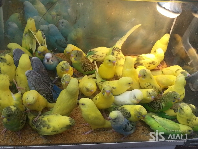 15일 오후 청계천 일대의 한조류 분양업소에서 노랑 잉꼬들이 한곳에 모여 봄맞이 준비를 하고 있다.