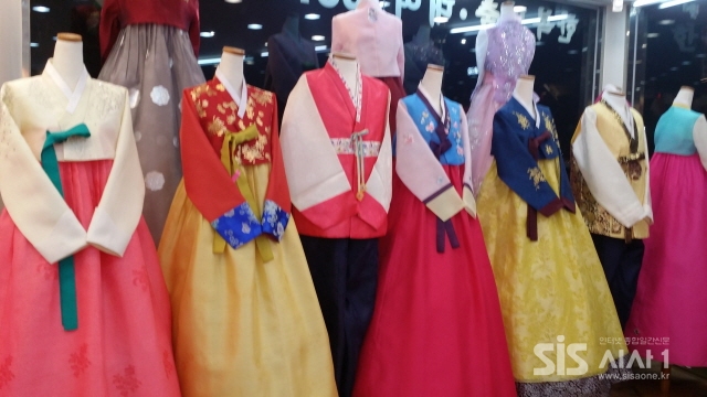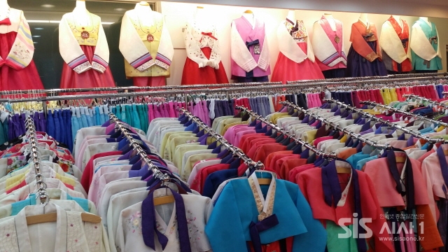 이제 봄 결혼식 시즌을 맞아 화려한 한복들이 전시되어 있다.