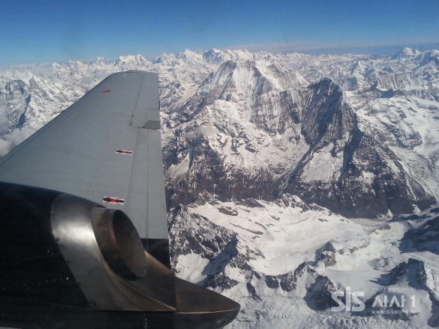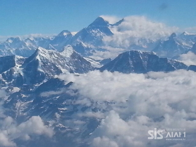 24일 비행기에서 본 히말라아 산이 흰 구름과 설경에 덥혀 있다.