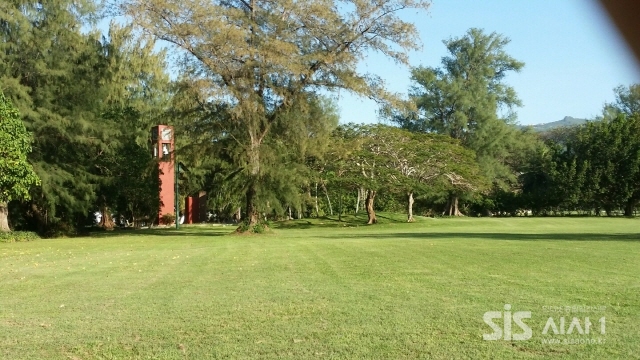 사이판 메모리안파크는 파란 잔디가 펼쳐져있고 그 뒤로는 큰 나무 숲이 있다. 또 바로 옆에는 피에스타 바다가 있어서 너무도 좋은 곳이다.