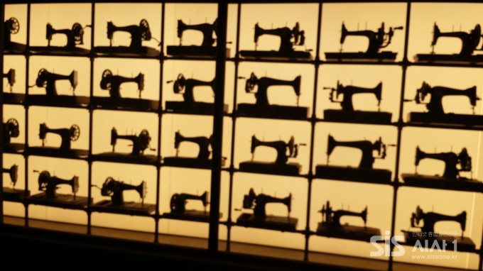 코엑스 입구 지1층에 수백개의 미싱이 하나의 작품으로 디스플레이 되어 있다.