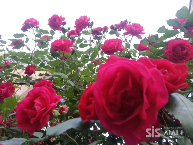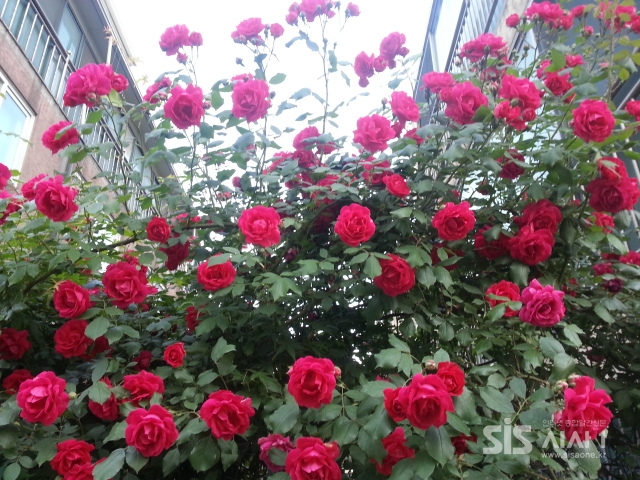 24일 서울의 한 주택가 사이로 강렬하고 빨강 장미가 미소 짓듯이 피어있다.