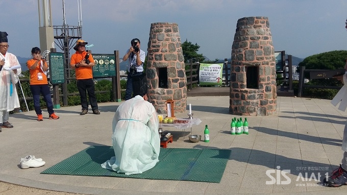 14일 민주평통 은평구협의회 자문위원 100여명이 구산동 봉산 봉수대에서 봉화 점화에 앞서 의식 행사를 하고 있다. 봉화 대축제는 전국 70군데에서 광주 70주년을 상징하여 릴레이 형식으로 행사를 진행했다.