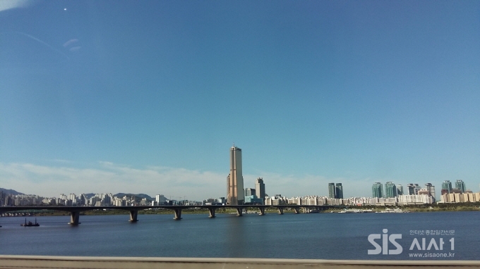 8일 서울 강변 북로에서 바라본 여의도가 모처럼 구름한점 없는 파란하늘과 파노라마처럼 펼쳐진 한강과 서울의 모습이다.