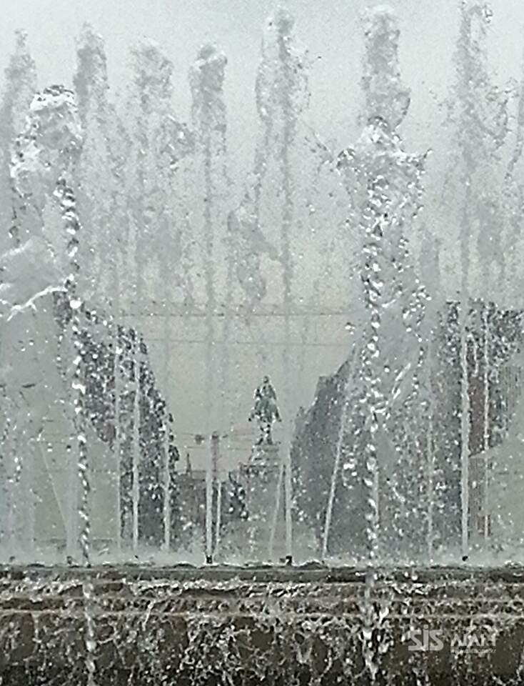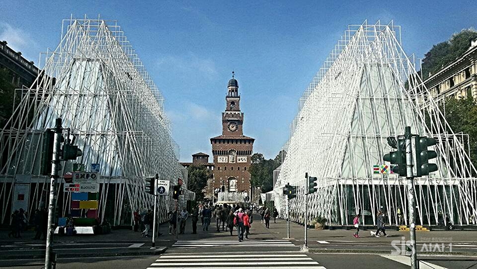 스포르체코 광장의 분수 사이로 보이는 국민영웅 가리발디장군 청동상, 밀라노엑스포 기념관이 있다.