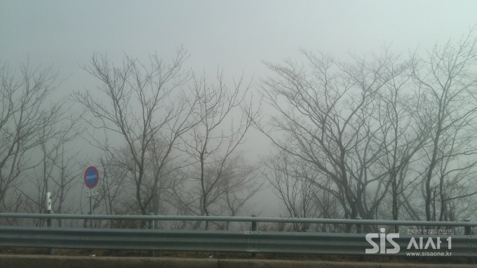 18일 한계령 주변일대가 안개로 뒤덮혀 사방이 뿌옇고, 안개사이로 벌거벗은 나무들의 형체만 보인다.