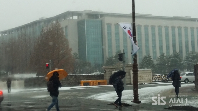 3일 오전부터 서울은 함박눈이 펑펑 내리고 있다. 국회앞 정원에 쌓인 눈과 국회앞의 눈오는 거리를 지나가는 사람들이 우산을 쓰고 가고있다.
