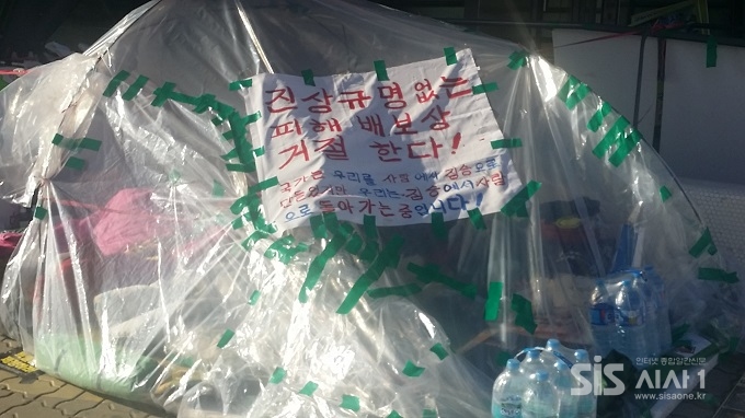 12월 12일 여의도 국회앞 비닐천막을 쳐 놓고 진상규명 없는 피해 배보상 거절한다. 라고, 시위하는 글귀가 눈에 띈다.