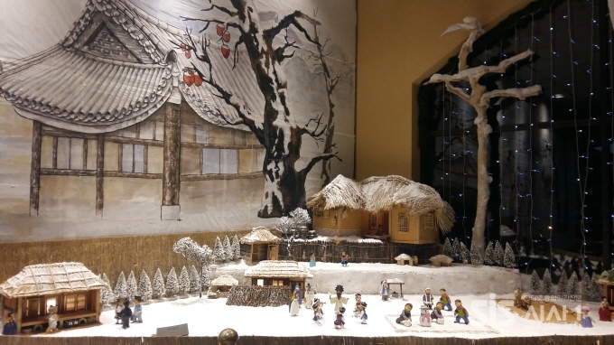 드레곤 호텔 힐 2층 로비에 한국 옛 시골 풍경의 조형물이 설치되어 있다.