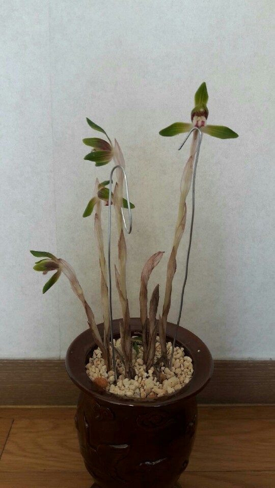 종로에 한 가정집에 잎이 없이 여러개의 꽃대만 있는 춘난이 아름다운 자태로 곧게 서며 피여있다.