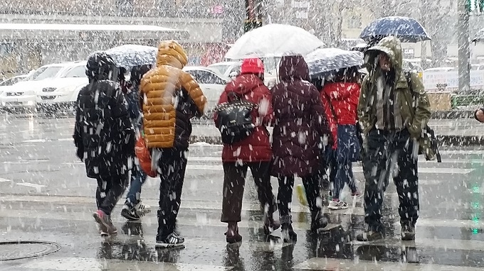 28일 서울 은평구 동명여고 옆에 있는 나무 가지들이 흰눈으로 쌓여 있고 거리의 행인들도 눈을 맞으며 갑자기 몰아친 눈 폭탄에 움추리는 모습이다.