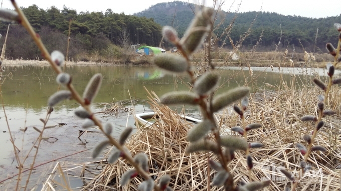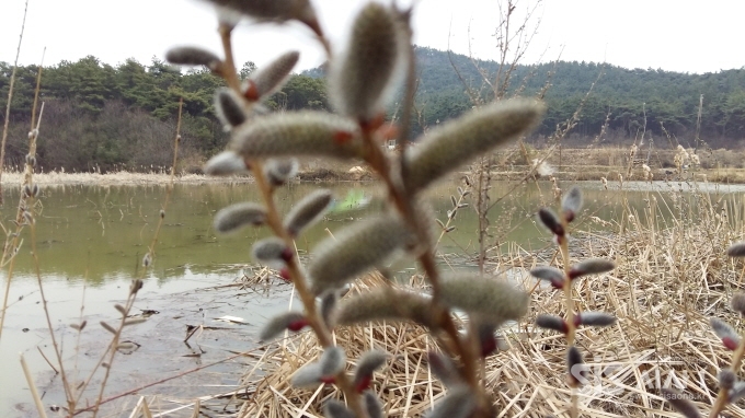 기온이 오르면서 14일 부안군 변산면의 한 저수지 주변에 버들 강아지가 하얀 솜털을 보이며 피어있다.
