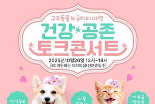 구조동물 보금자리 마련 자율 후원, 제2회 건강·공존 토크 콘서트가 문대림 더불어민주당의원, 사단법인 유기농문화센터, 사단법인제주동물권행동, ㈜베지노믹스페어 비건페스타 공동 주최로 오는 26일 오후 1시부터 오후 6시까지 국회의원회관 대강당에서 열린다. 제1회 건강·공존 토크 콘서트는 지난 8월 2일 오후 같은 장소인 국회의원회관 대강당에서 열린 바 있다.