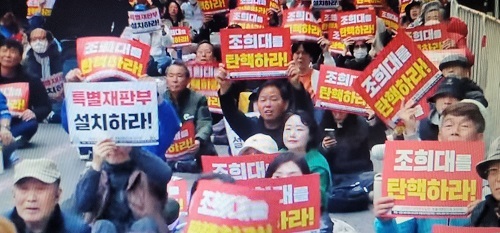 "조희대를 탄핵하라. 특별재판부 설치하라." "내란정당 국힘당 해산하라"