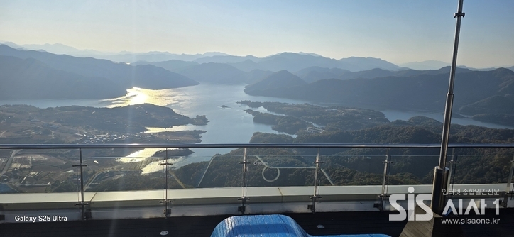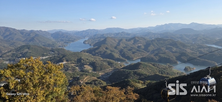 시사1 장경훈 기자 | 산수화 처럼 펼쳐진 산 사이 사이에 청풍호가 파란 호수처럼 보인다.