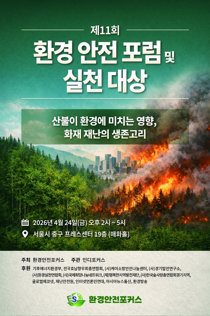 포럼에서는 산불이 대기질, 생물다양성, 도시 안전에 미치는 영향에 대한 전문가 발표와 함께, 화재 재난 상황에서의 생존 전략 및 지역사회 대응 체계 구축 방안이 공유될 예정이다. 또한 환경 안전 분야에서 실질적인 공헌을 한 개인 및 단체를 선정해 ‘실천 대상’을 시상함으로써 현장의 노력을 격려하고 확산하는 계기도 마련된다.