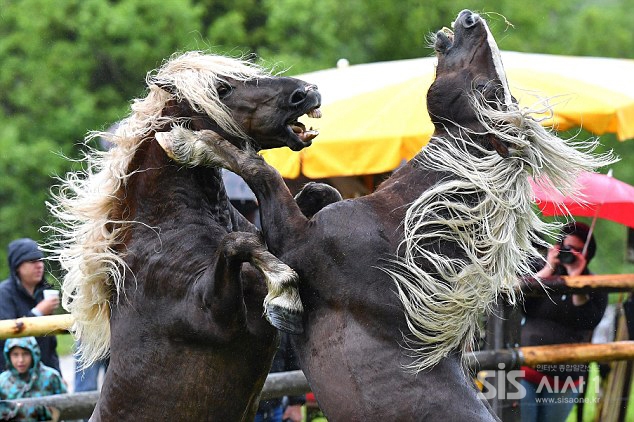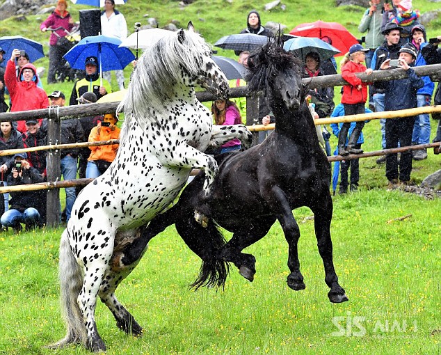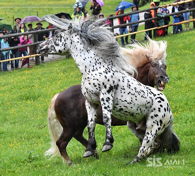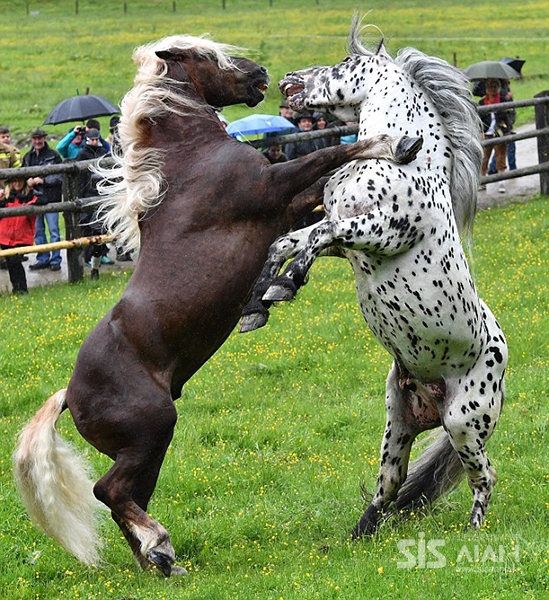 6월 19일, 영국 “데일리 메일”의 보도에 의하면 최근 오스트리아에서 종마경기가 진행됐다. 종마 수마리가 한 원형 경기장에 에워싸여 도약과 발 차기를 통해 상호 공격하면서 종군중에서 자신의 등급지위를 수립하고 있다.