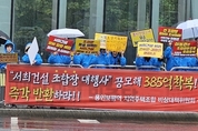 시사1 윤여진 기자 | 용인보평역 지역주택조합 비상대책위원회가 비가 네리는 가운데 국회 앞에 모여 "서희건설 조합장 대행사"공모해 385억 착복이라는 현수막을 내걸고 서희건설을 비판하는 집회를 하고 있다. 손 피켓 문구에는 '서희건설 비리 감사원·검찰은 뭐하나' , '이봉관은 조합원 돈으로 호위호식' , '일반분양보다 1억이상 비싸게 산 조합원이다 더이상 낼돈없다' 등의 문구가 적힌 핏켓을 들고 구호를 외치고 있다.