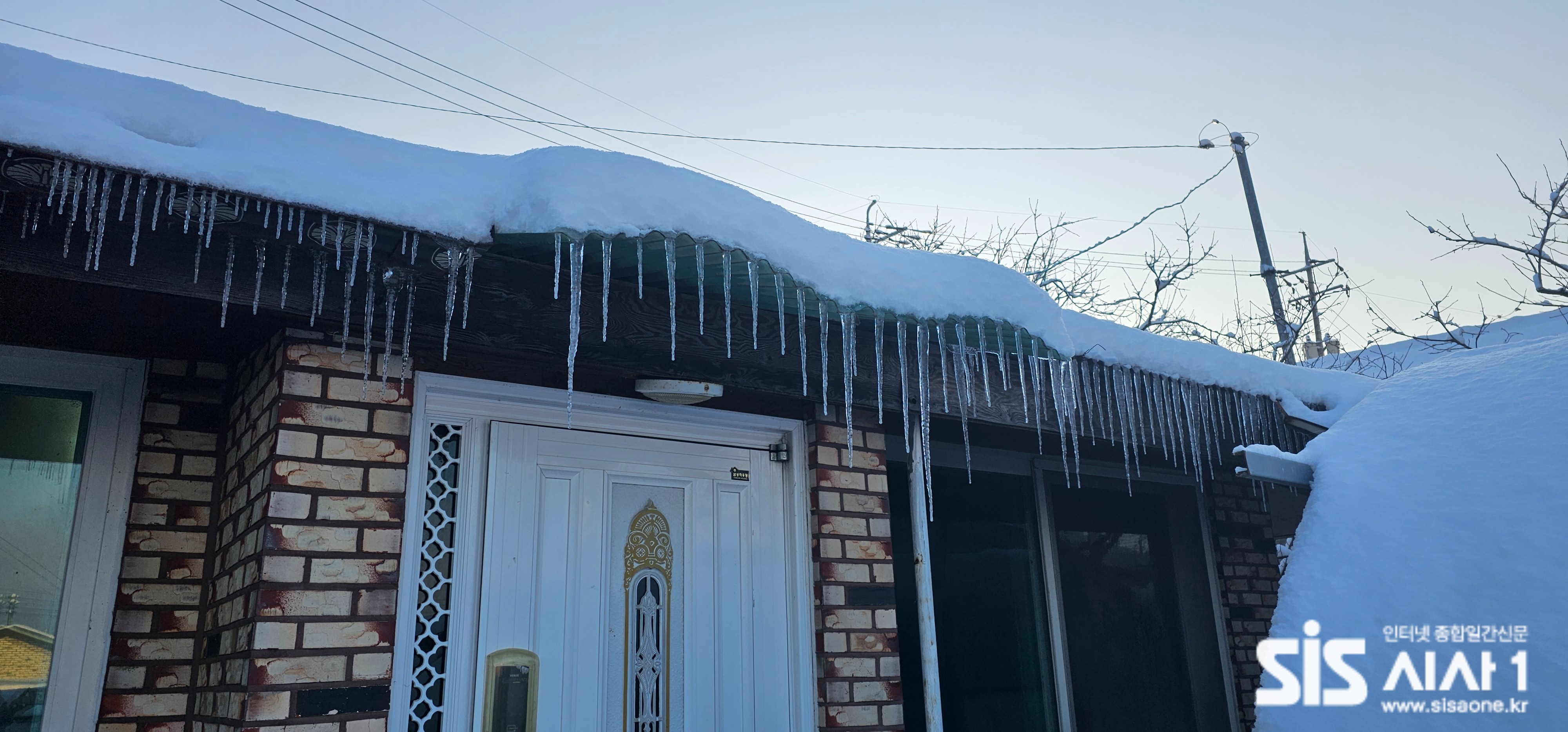 폭설과 한파에 집붕 위에는 많은 눈이 쌓여 있고, 처마밑에는 고드름이 줄줄이 매달려 있다.