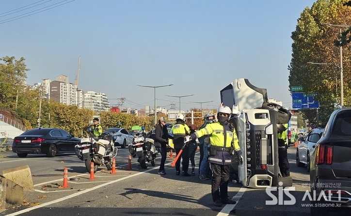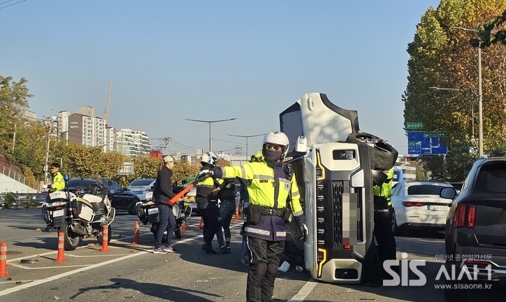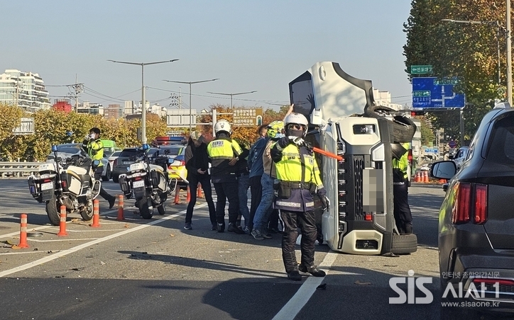시사1 윤여진 기자 | 16일 동작대교 강북 쪽(용산구청 방향) 끝나는 지점 내리막 길에 SUV자동차가 옆으로 넘어진 사고가 발생해 경찰이 사고 수습을 하고 했다.