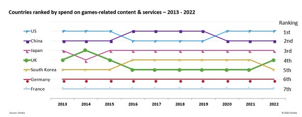 옴디아가 2013년부터 2022년까지 지난 10년간 게임 관련 콘텐츠와 서비스에 지출한 금액을 기준으로 국가 순위를 매긴 결과, 미국, 중국, 일본, 영국, 한국이 상위 5위를 차지했다.