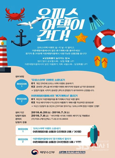 이 외에도 개인 페이스북이나 블로그 등 누리소통망서비스(SNS)에 이벤트 내용을 스크랩해 공유하는 30명에 어촌체험마을 상품권과 수산물 특산품 등을 증정하는 ‘소문내기 이벤트’도 진행된다.