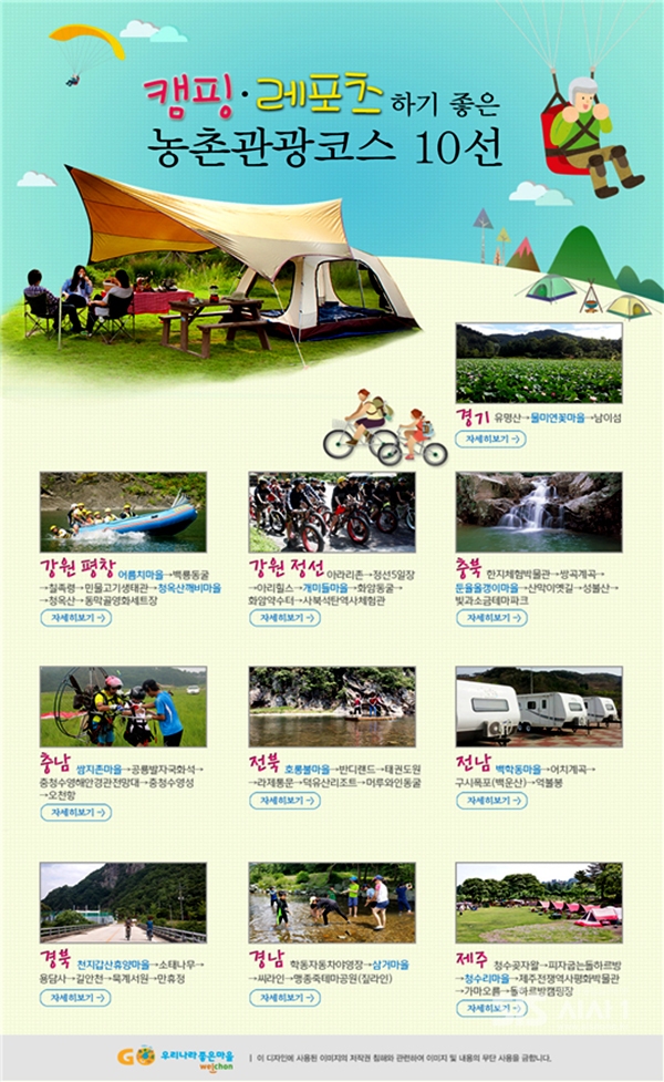 농림축산식품부와 한국농어촌공사는 7월 본격적인 여름 휴가철을 앞두고 도시민에게 농촌 체험여행에 대한 정보제공을 통해 도시민의 여름휴가 수요를 농촌으로 유도하고자‘캠핑 ․ 레포츠하기 좋은 농촌관광코스 10선’을 선정 발표했다.
