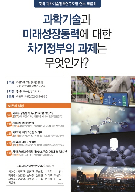 국회 과학기술정책연구모임과 더불어민주당 정책위원회가 공동주최하는 『과학기술과 미래성장동력 에 대한 차기정부의 과제』 연속 토론회를 개최, 경제와 일자리의 해법을 찾기 위한 자리를 마련한다.