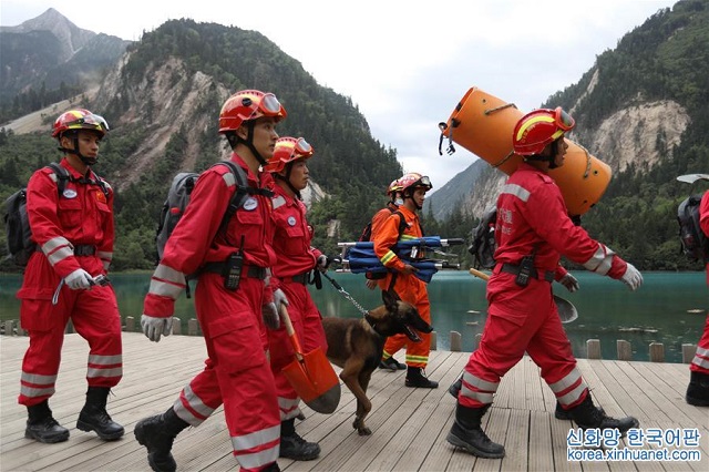 지난 12일 중국 주자이거우 슝마오하이 풍경구를 향해 가는 긴급 구조요원이 이날 중국국제구조대와 쓰촨 무장경찰 광위안 소방지대 등으로 구성된 주자이거우 지진 긴급 구조대가 또 한번 20여명을 투입해 주자이거우 슝마오하이 부근에서 실종자를 수색하고 있는 현장이다.