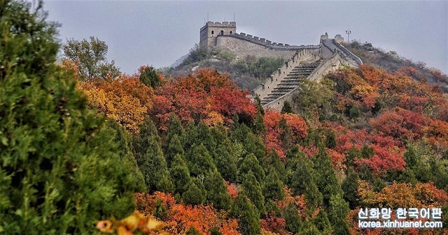 중국 만리장성의 바다링의 첩첩이 들어선 수림의 나뭇입들이 온통 붉게 물들어있다. 베이징 옌칭 구에 위치한 바다링 국가삼림공원 훙예링 풍경구내의 5만 그루가 넘는 거먕옻나무, 굴피나무 등이 화려하게 물들어 있어 관광객들의 시선을 끌고 있다