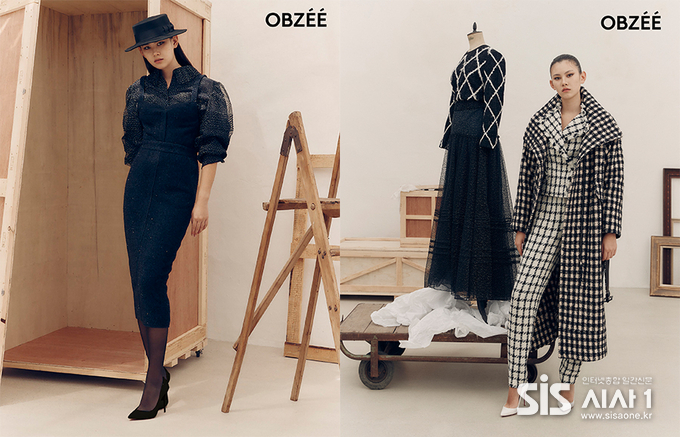 공개된 화보에서는 비즈 디테일이 돋보이는 벌룬 소매 블라우스를 펜슬 스커트와 매치해 과감함과 절제미가 절묘한 균형을 이룬다. 블랙 컬러지만 소재와 구조적인 실루엣의 조화로 화려함이 강조된 룩으로 평범한 일상 속 기분 전환을 위한 데일리룩으로 활용 가능하다. 이외에도 컬러와 선의 굵기에 변주를 준 체크 패턴의 코트와 수트 셋업을 함께 매치해 오브제만의 유니크하고 모던한 감성을 우아하게 풀어낸 클래식 룩을 완성했다.