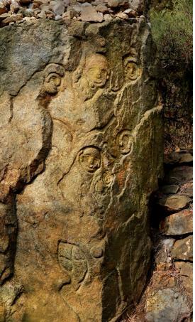 ① 상단 왼쪽의 얼굴은 길이 15세티, 폭 9센티 정도의 크기로 큰 코에 눈과 입에서 미소를 띄우고 있으며 머리는 삭발하지 않고 턱은 수염을 표현한 듯 두툼하고 45정도의 아래를 바라보고 있다.
