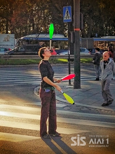 폴란드 크라쿠프의 길거리에서는 20대의 젊은 여성이 자동차들이 신호를 기다리는 잠깐의 순간에 형형색색의 플라스틱 곤봉을 들고 묘기를 부리며 운전자들에게 볼거리와 기쁨을 주고 있다.