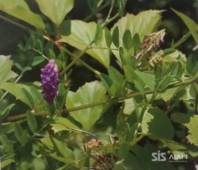 잎은 잎자루가 거의없고 꽃은 6~9월에 홍자색 꽃이 4~8㎝의 총상 꽃차례를 이루며 잎겨드랑이에 총총히 달려많이 피는데 꽃자루가 길고 한쪽으로 치우친다. 꽃부리는 길이 12㎜쯤으로 나비 모양이다. 또 열매는 8~9월에 길이 2~2.5㎝인 긴 타원형의 납작한 협과가 꼬투리 지어 달리는데 털이 없다.