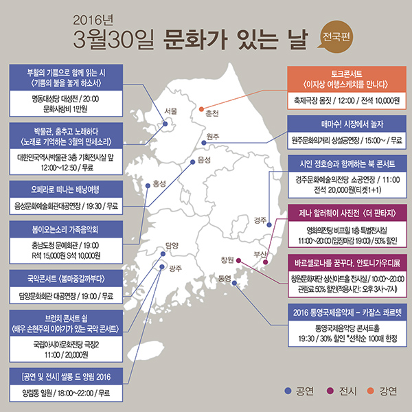 이에 따라 부산, 광주, 인천 등 7곳은 30일 각종 음악 공연과 전시 등 '문화가 있는 날' 행사를 연다.