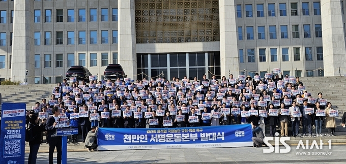 (시사1 = 윤여진 기자)더불어민주당이 국회 본청 앞에서 '김건희 특별법' 수용을 촉구하는 전국민 서명운동본부 발대식을 했다. 민주당은 세 번째로 발의된 '김 여사 특검법'에 윤 대통령이 거부권을 행사할 경우, 재표결이 예상되는 28일까지 전국 각지에 서명운동본부를 설치해 집중 서명운동을 벌일 계획이라고 했다.