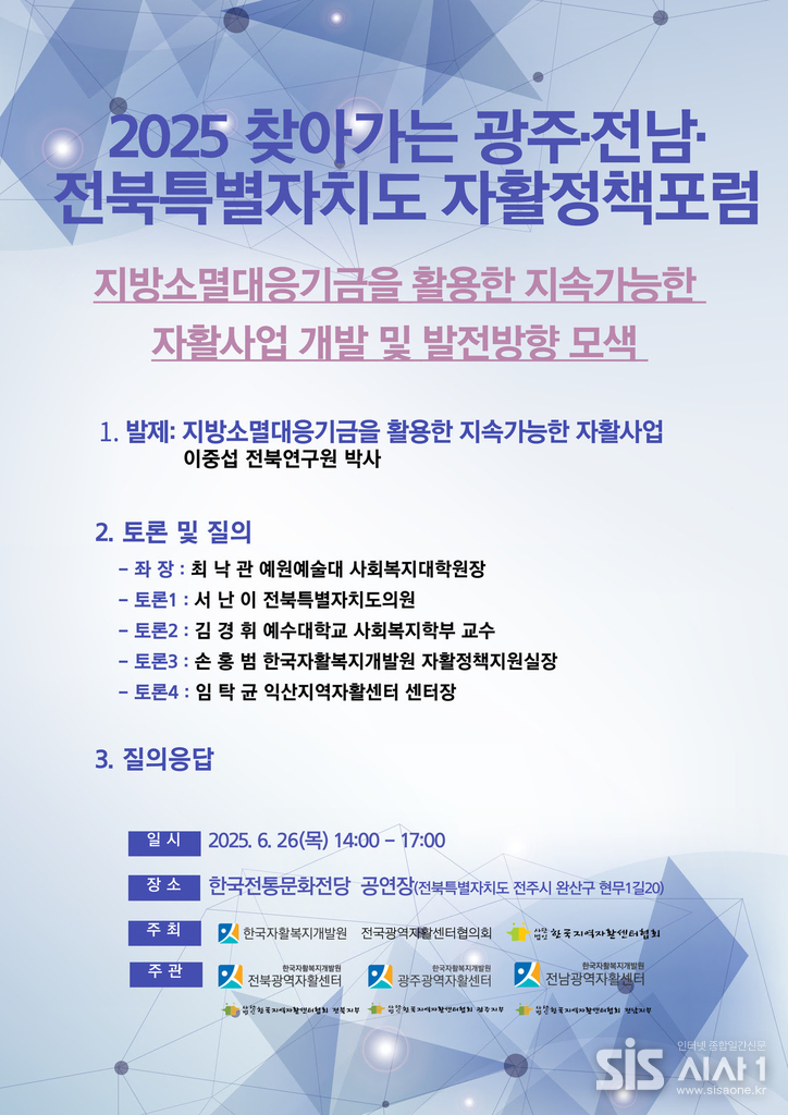 시사1 박은미 기자 | 한국자활복지개발원은 오는 26일 전주시 한국전통문화전당에서 ‘2025 찾아가는 광주·전남·전북특별자치도 자활정책포럼’을 개최한다고 19일 밝혔다.