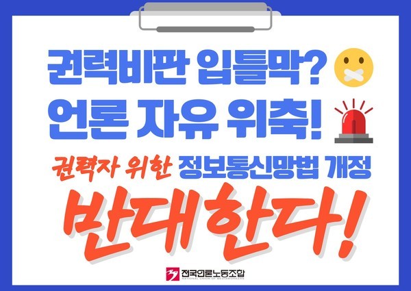 이를 두고 언론노조는 지난달 27일 기자회견을 통해 “권력 비판에 입틀막으로 작용할 수 있다”며 “권력자를 위한 정보통신망법 개정을 반대한다”고 밝혔다.