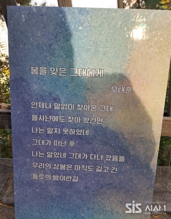 시사1 김아름 기자 | 우태훈 본지 논설위원의 시 작품 ‘봄을 잊은 그대에게’가 문화체육관광부·성동구청·성동문인협회 주관 아래 최근 진행된 ‘응봉산 시화전 행사’에 전시됐다. 사진은 우태훈 논설위원의 시 작품 ‘봄을 잊은 그대에게’ 시화전 전시품.