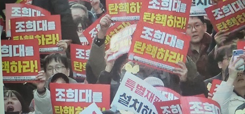 신동욱 강남서초 촛불행동 회원은 "내란의 밤, 나경원과 국힘당 의원들은 윤석열과 돌아가며 통화했다"며 "내란에 동조한 국힘당은 이미 해산되었어야 마땅하다. 계엄 해제 투표를 거부한 국힘당 의원들은 자진 사퇴를 해도 모자라다"고 지적했다. 이어 "한 명, 한 명이 내란범으로 처벌받아야 하는데, 조희대 사법부는 내란 동조범들을 다 풀어주고 있다"며 "이래서 내란 세력 최후 보루가 조희대라고 이야기하는 것 아닌가"라고 반문했다.