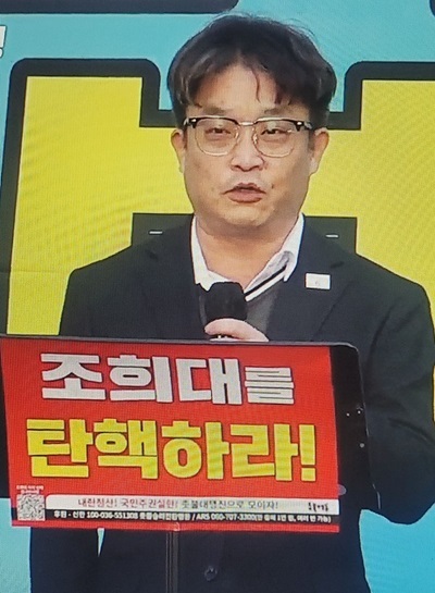신동욱 강남촛불행동회원이 22일 오후 조희대 탄핵 촉구 집회 무대에서 "조희대 사법부는 내란 동조범들을 다 풀어주고 있다"며 "이래서 내란 세력 최후 보루가 조희대라고 이야기하는 것"이라고 비판했다.