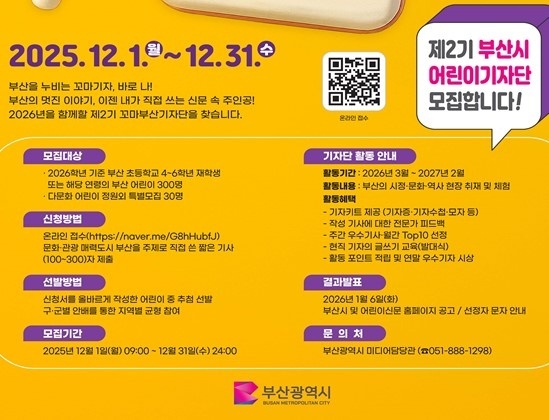 신청은 네이버폼(http;//naver.me/G8hubfj)을 통해 가능하며, 최종 합격자는 내년 1월 6일 부산시와 어린이신문 누리집을 통해 발표된다.